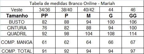 OBS: Como se trata de uma produção artesanal, pode acontecer variação de 02 cm para mais ou para menos, baseado na tabela de medidas.